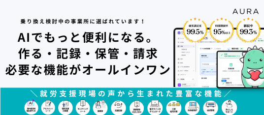 「非効率0は、人を活かす」 AURA就労支援は、就労移行支援・就労継続支援(A型・B型)事業所のために開発された AIアシスタント型クラウドサービスです。 …