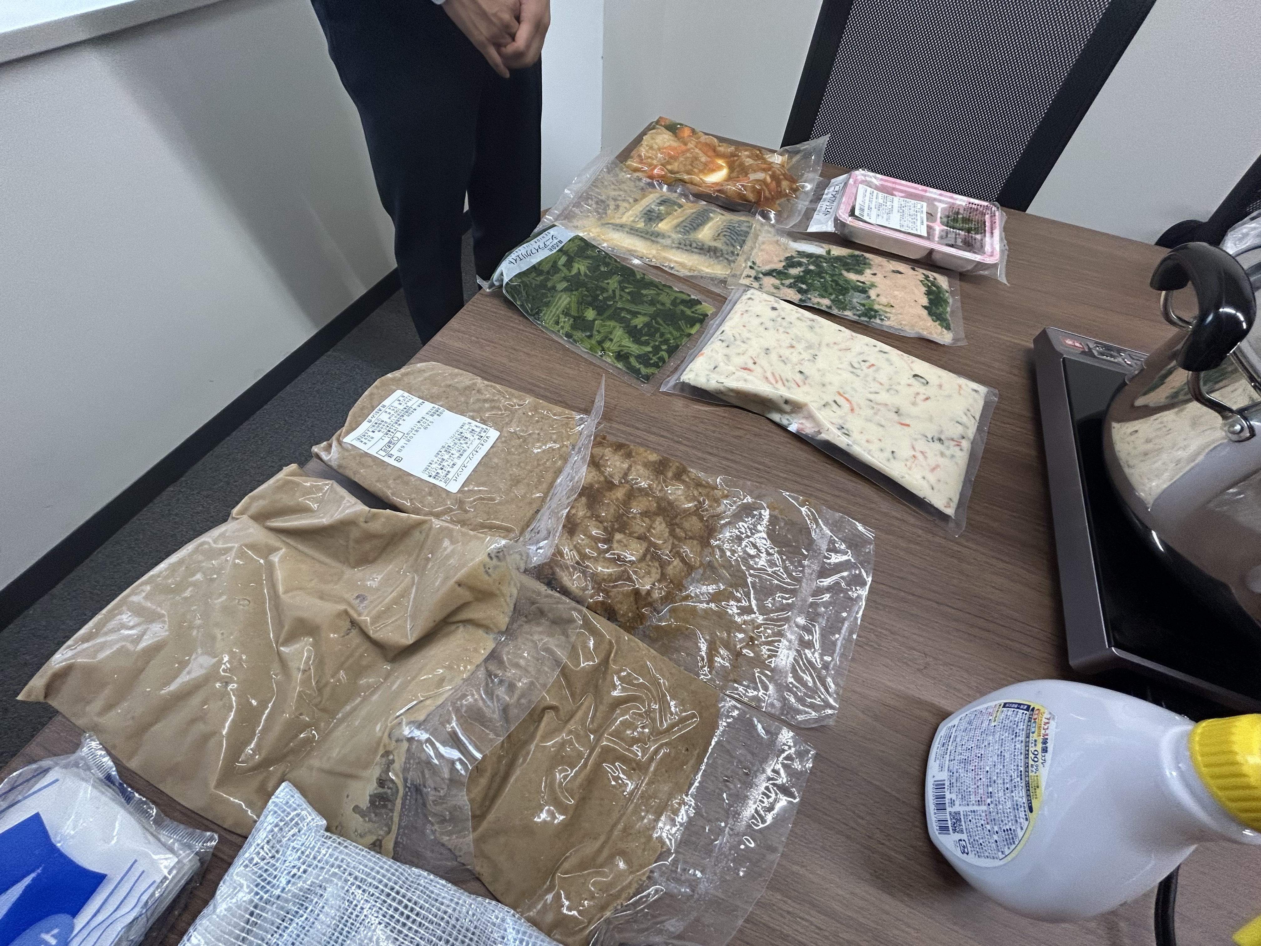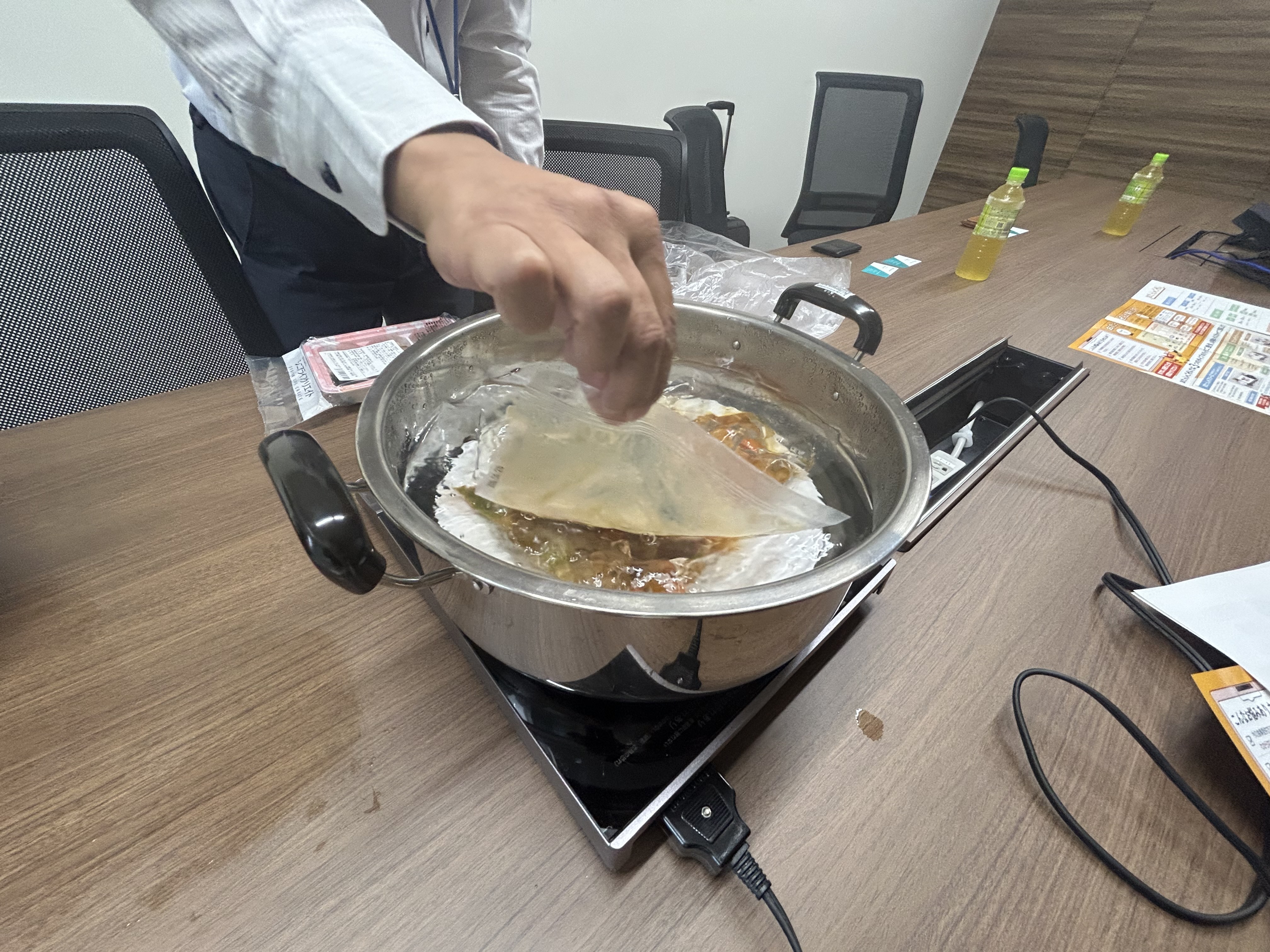 調理はお湯を沸かして温めるだけ。会議室のような場所でもお湯と鍋さえあれば簡単に調理可能です。温める時間は食事や量にもよりますが、今回は10分〜20分程度で温かい食事の準備ができました。