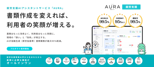 「非効率0は、人を活かす」 AURA就労支援は、就労移行支援・就労継続支援(A型・B型)事業所のために開発された AIアシスタント型クラウドサービスです。 …