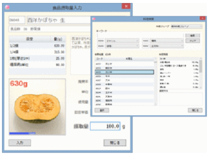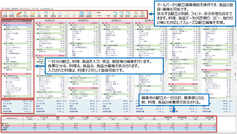 画面下部に栄養素が表示でき、エクセル感覚でザクザク編集できます。