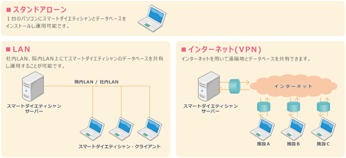 運用にあわせて、「スタンドアローン」「LAN」「クラウド」の3つのシステム構成をお選びいただけます。
