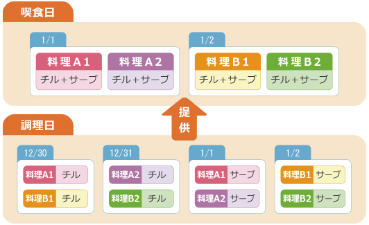 ・料理単位の調理日、発注日設定。業者単位の納品日も設定可能。