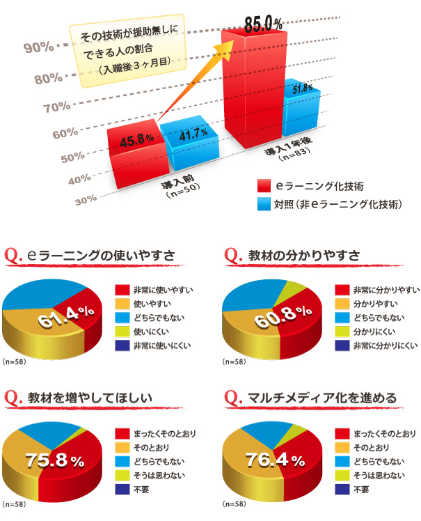 eラーニングで学習した技術は習熟度が劇的に改善しました。これがeラーニングだけの効果であるとは言いきれませんが、大きなウエイトを占めているのは確かです。