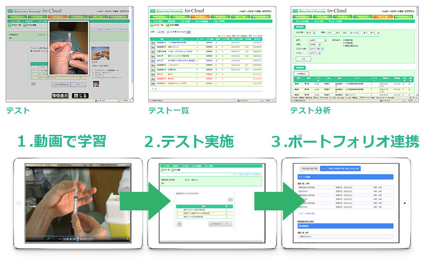 eラーニングシステム「メディカルナイスナレッジ」は、PCやタブレットを用いて好きな時にいつでも受講可能。個々のスタッフの理解度や習熟度を見える化すると同時に、教育担当者の教材作りの負担を大幅に軽減いたします。