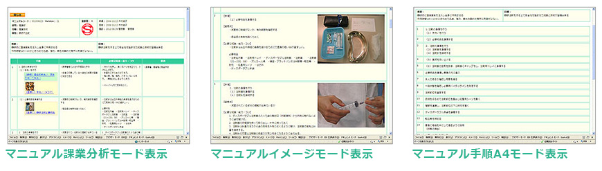 マニュアルは課業分析モードとして4つの領域で構成されており、画像・動画・添付ファイルが添付でき理解しやすい教科書として活用されます。