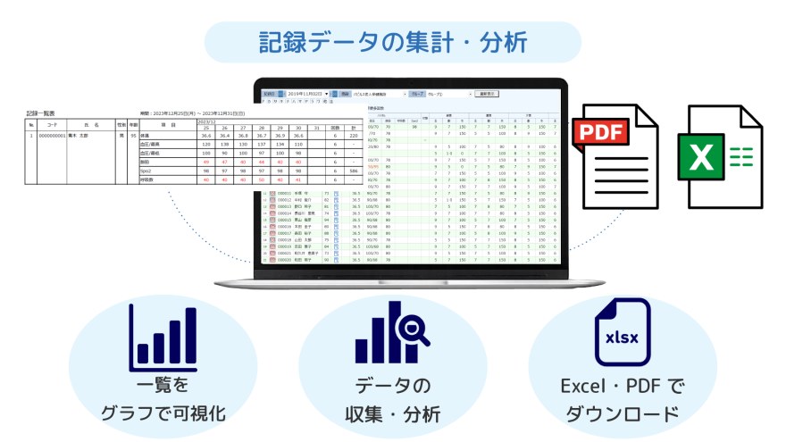 日々入力された記録データを一覧表示や統計資料として確認することができます。