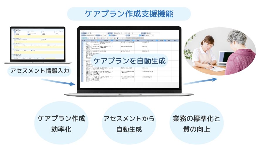 アセスメント情報をもとにケアプランの基本内容を自動生成することができます。