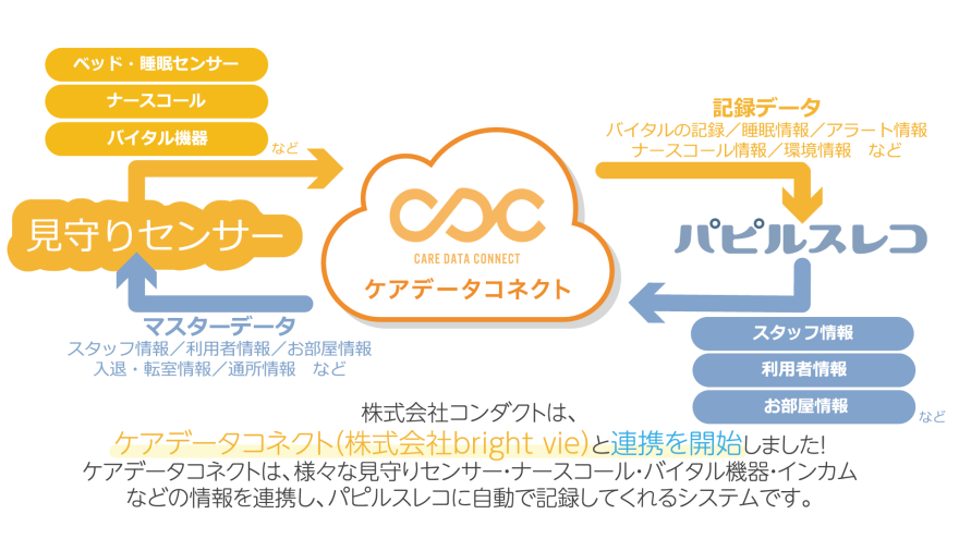 ケアデータコネクトを通じて見守りセンサーなどの機器と連携することが可能です。