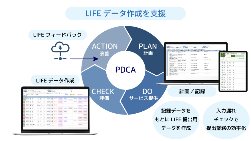 入力された記録データをもとにLIFE提出用データの作成が可能です。