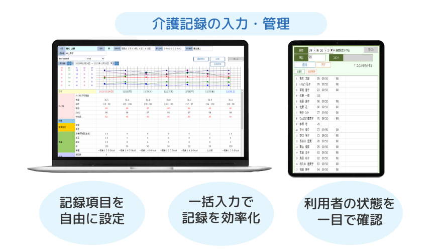 バイタル、食事、排泄などの生活記録を簡単に入力・管理でき、PCやタブレットから場所を問わず記録が可能です。