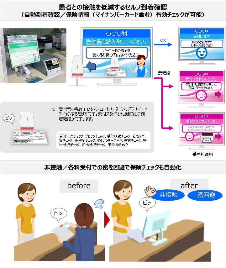 受付のそばにディスプレイとバーコードスキャナを設置、受付表の患者IDをバーコードリーダ(ハンズフリー)でスキャンするだけで、受付スタッフとの接触なしに到着確認が完了します。