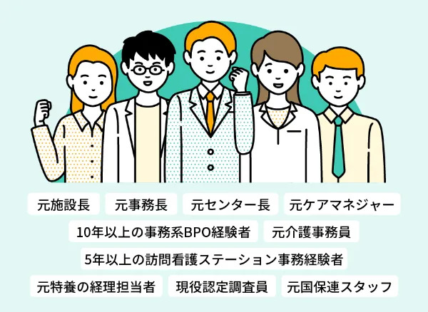 元施設長、元事務長、元ケアマネージャー、元介護事務員など訪問看護の医療レセプトにも精通したスタッフも加わりチームを編成します。