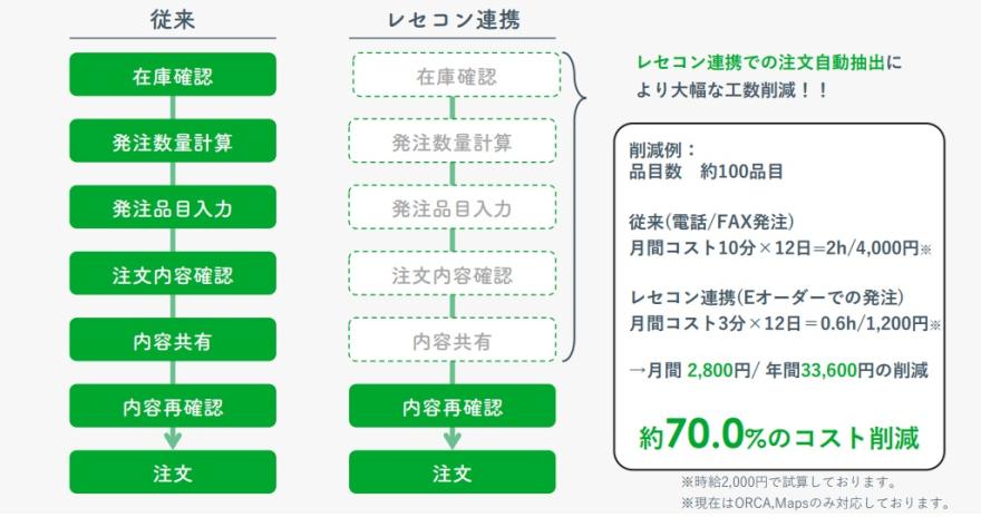 レセコン・卸会社と連動し、自動的に在庫情報を反映することで発注・在庫管理業務の改善を目指します。