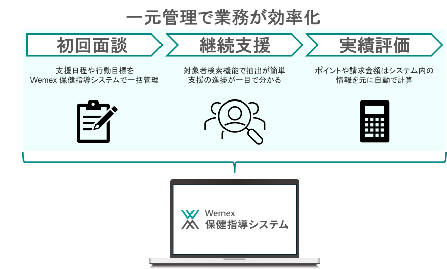 Wemex 保健指導システムは、保健指導業務の効率化と質の向上を実現するクラウド型支援システムです。