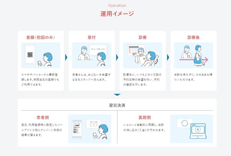 患者さんは初回にスマホ等で事前登録し、受付で後払いを希望します。診療と次回の予約確定後、会計待ちなくそのまま帰宅できます。