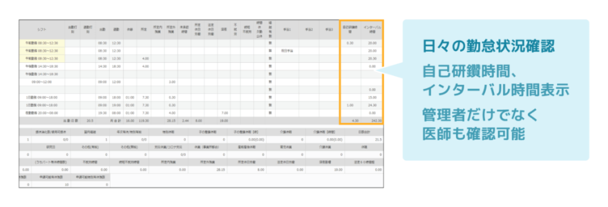 2024年4月から施行された医師の働き方改革に伴う、勤務間インターバルのチェックや自己研鑽時間の管理、様式9(医師労働時間等の様式)のデータ出力機能を搭載。法改正による労務リスクを最小限に抑えられます。