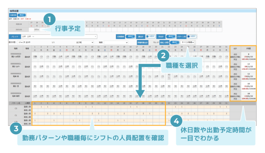 行事予定や休日数、人員配置を確認しながらシフトを作成できます。
