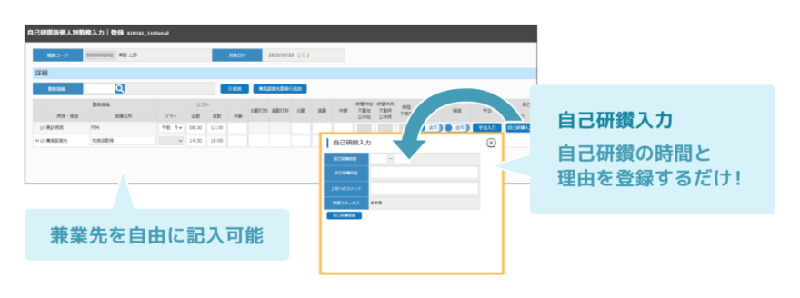 医師または管理者が自己研鑽時間の入力を行います。兼業先労働時間の記入と勤怠管理も可能です。